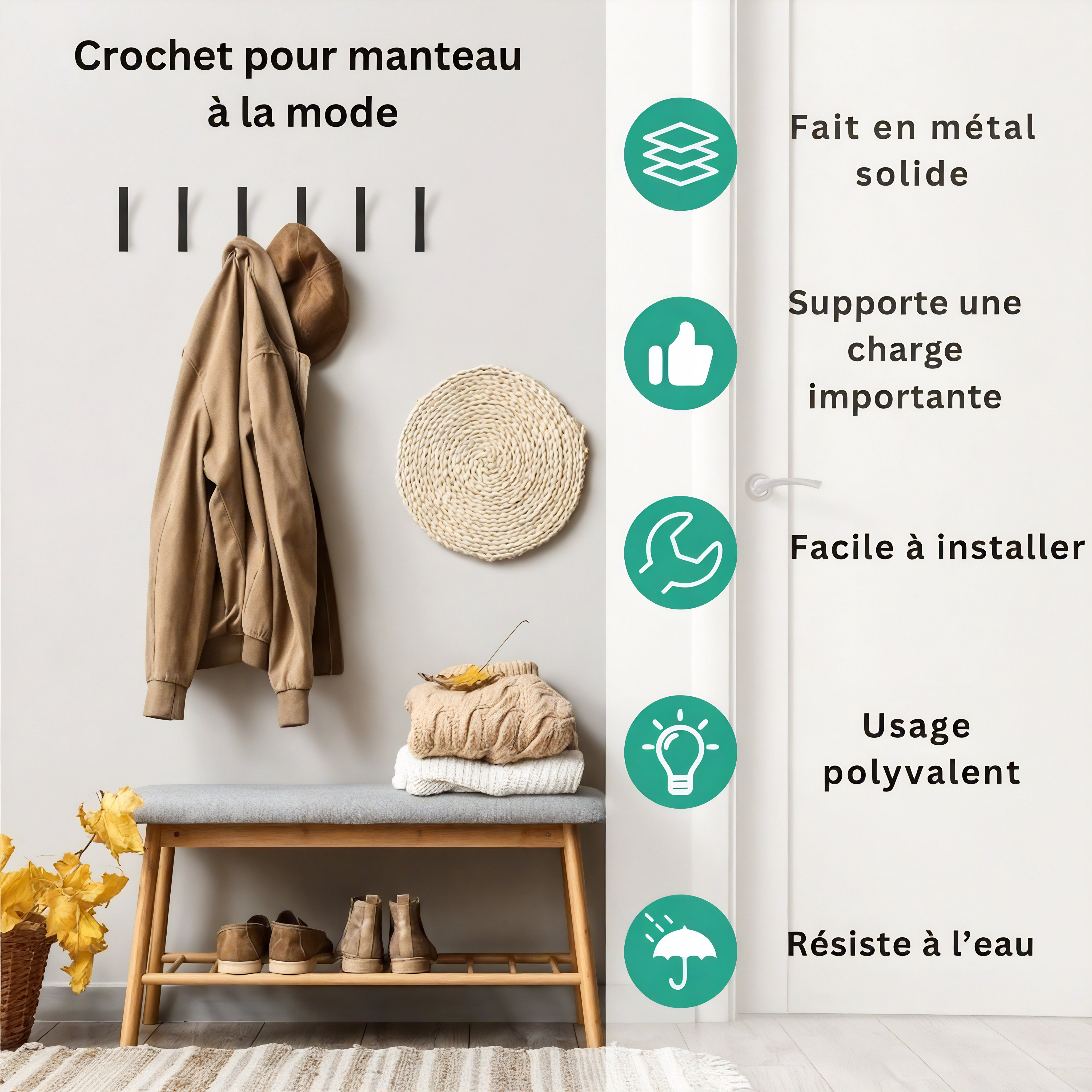 Multi-usages : Idéal pour suspendre manteaux, sacs, serviettes, peignoirs, clés, écouteurs, ustensiles, etc.