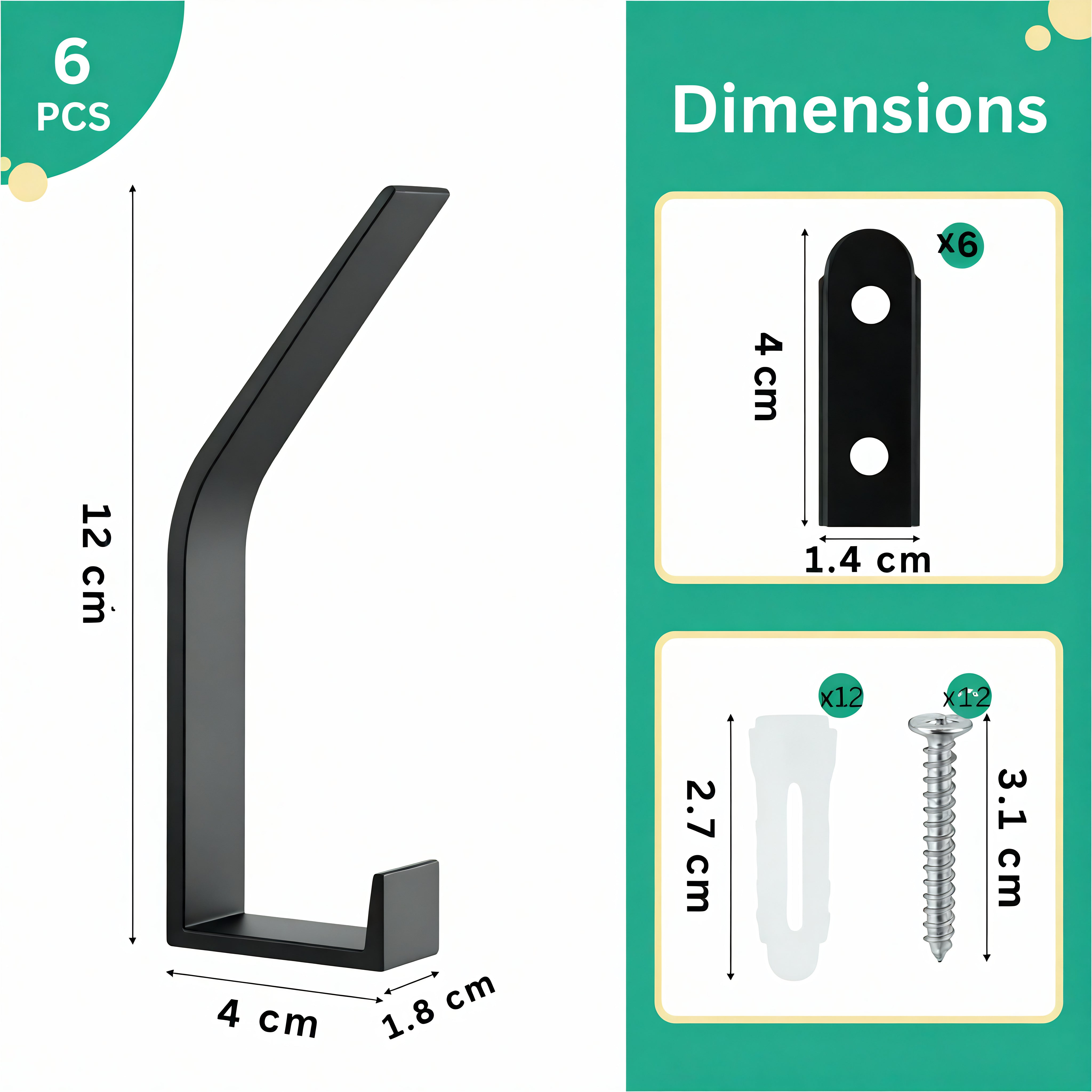 Contenu du colis : 6 patères individuelles, 12 vis + 12 chevilles, 6 plaques de fixation à vis cachées