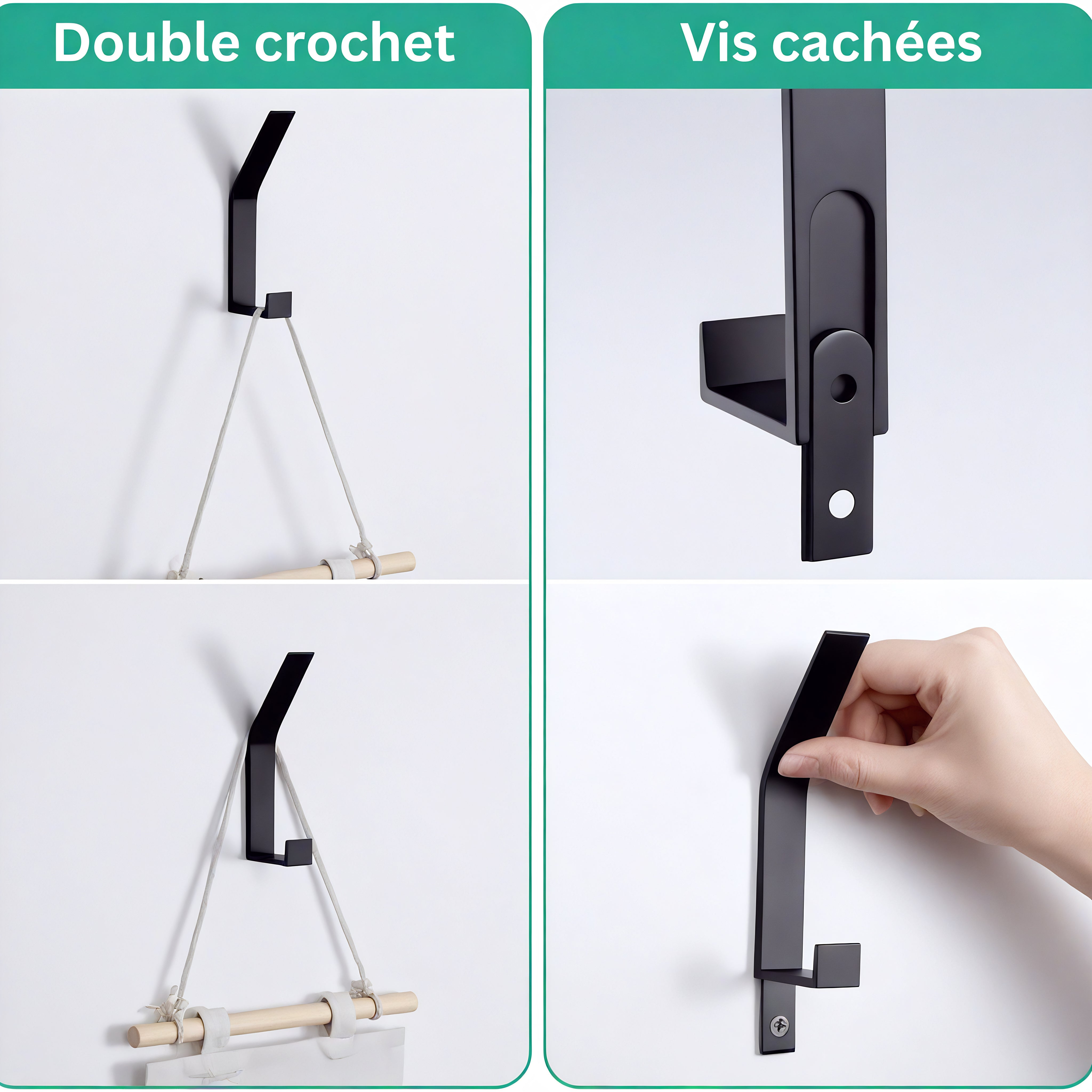 Design pratique : Double crochet (haut + bas) pour plus de capacité, design minimaliste, moderne et élégant, finition polie, angles arrondis pour éviter d’abîmer les tissus