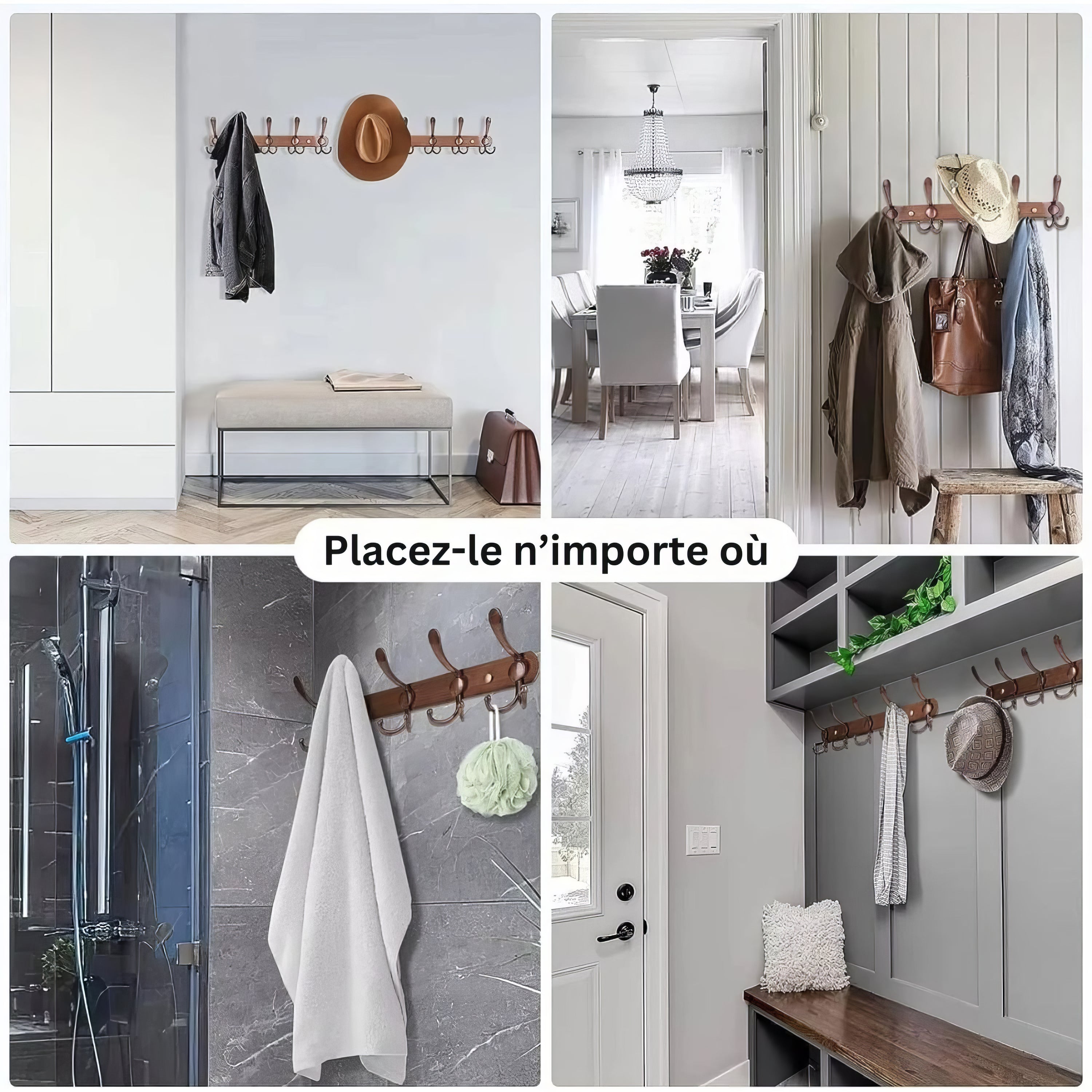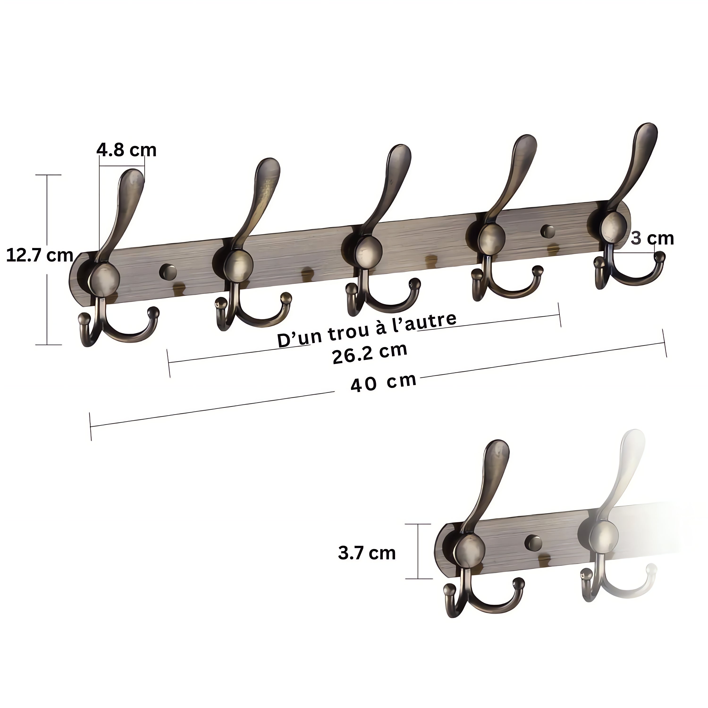 Design pratique : 5 crochets doubles (haut + bas) pour maximiser l’espace de rangement sans encombrer le mur