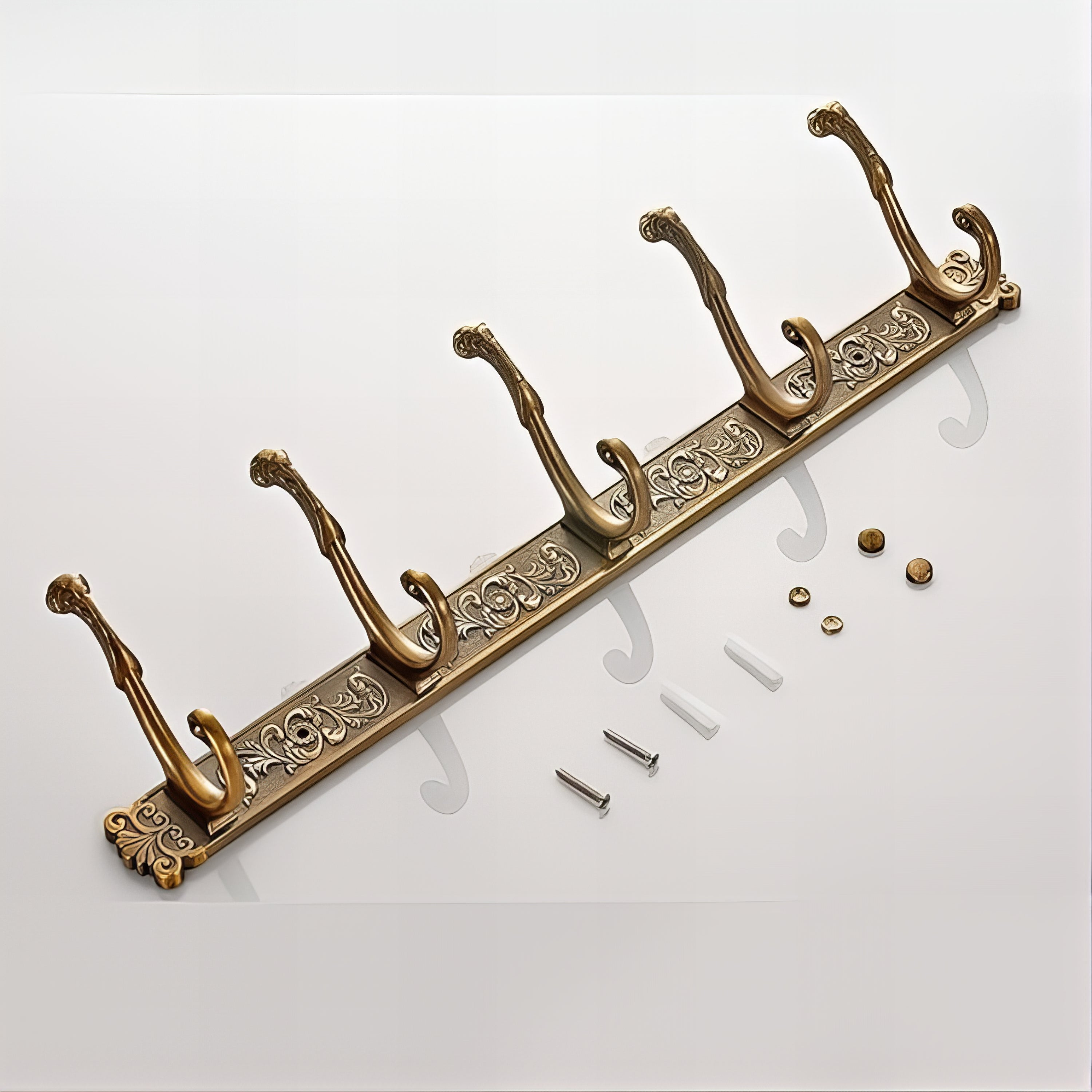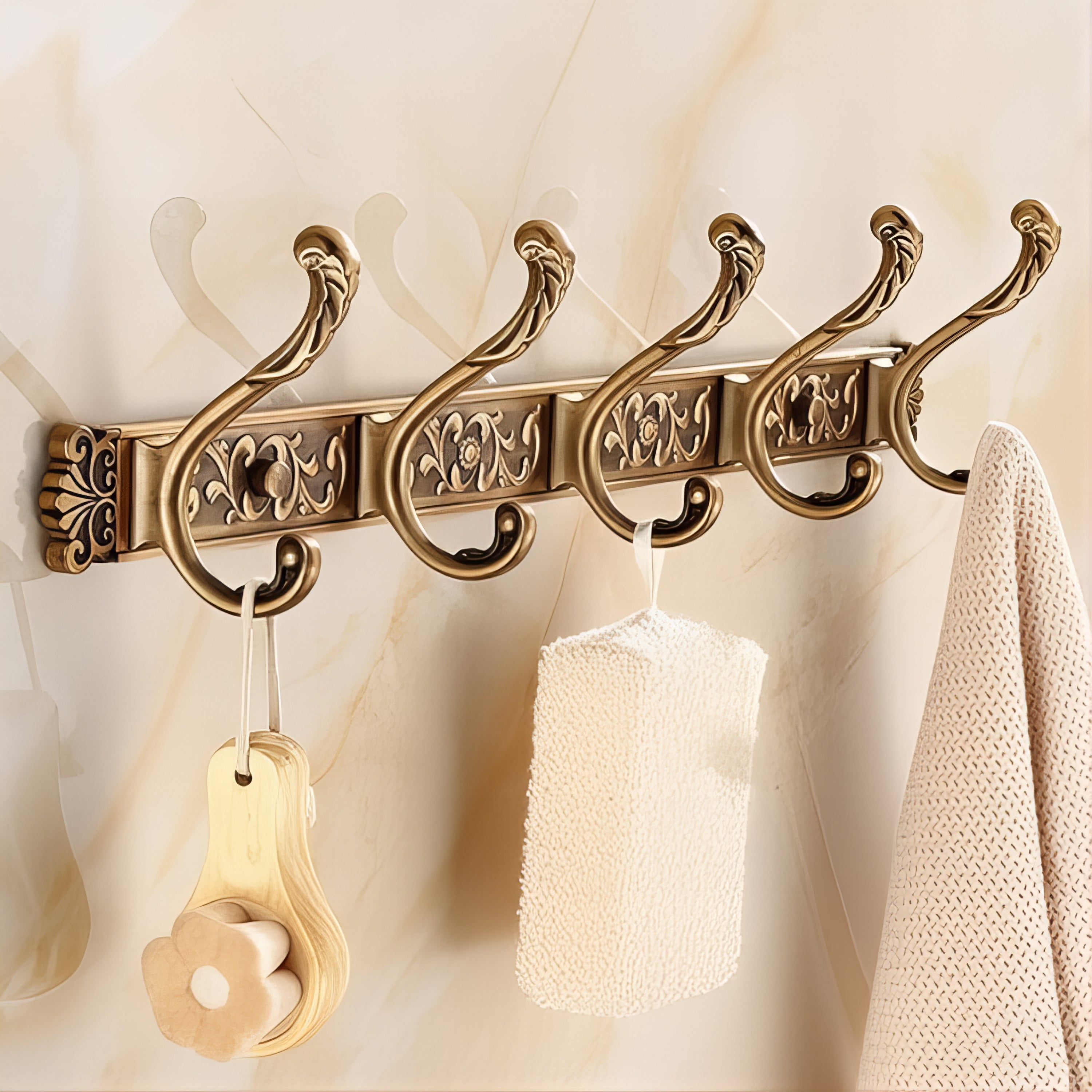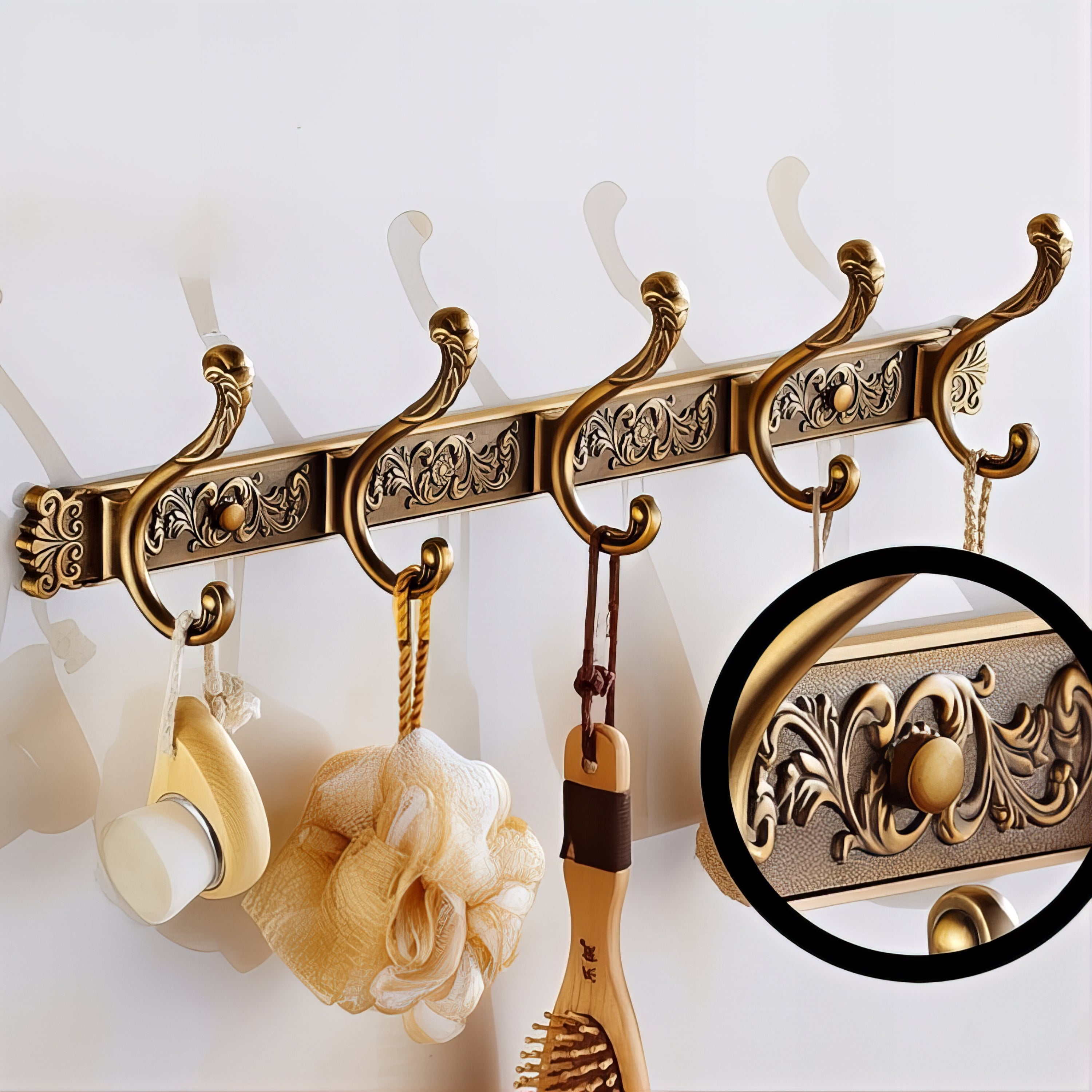 Contenu du colis : 1 porte-manteau mural en alliage doré (5 crochets doubles), 2 vis + 2 chevilles d’ancrage, cache-vis décoratifs assortis, notice d’installation rapide.