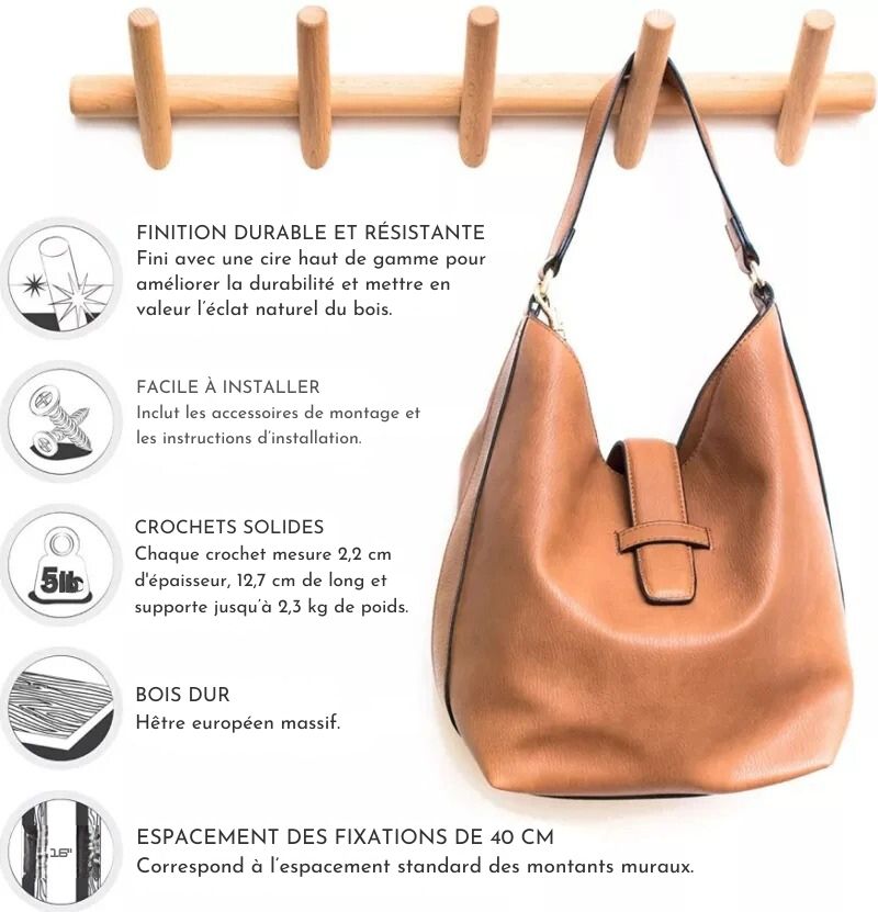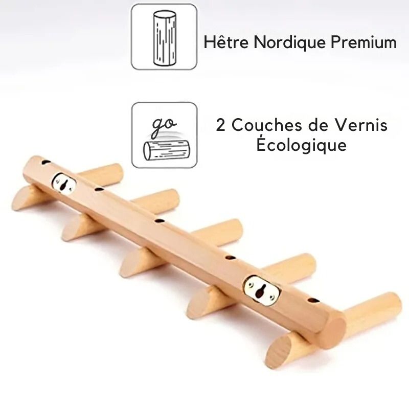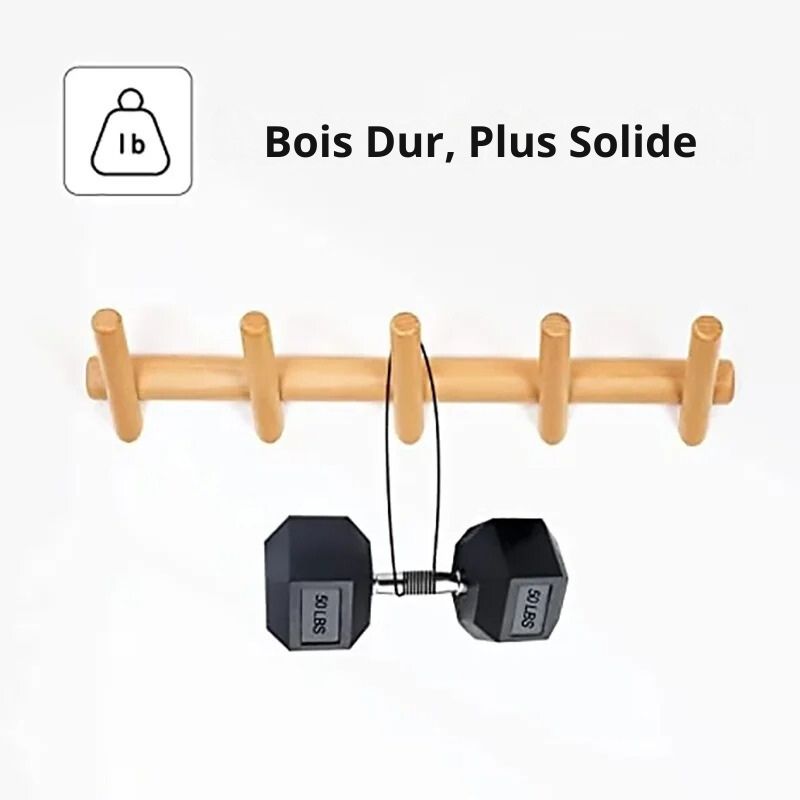 Conçu en hêtre massif européen, ce porte-manteau offre une résistance exceptionnelle. Ses crochets solides supportent jusqu’à 2,3 kg par crochet, parfait pour vos objets du quotidien, petits comme lourds.