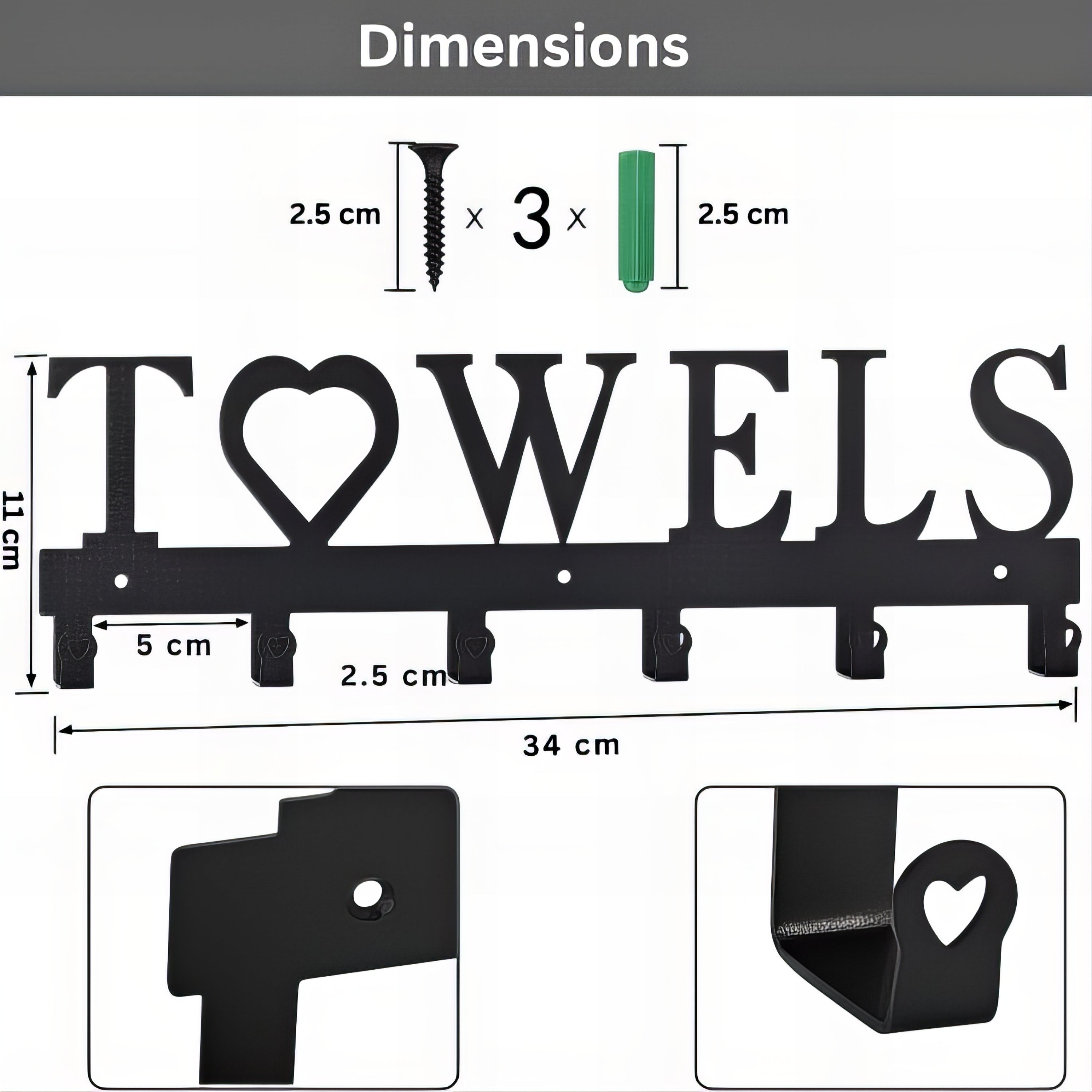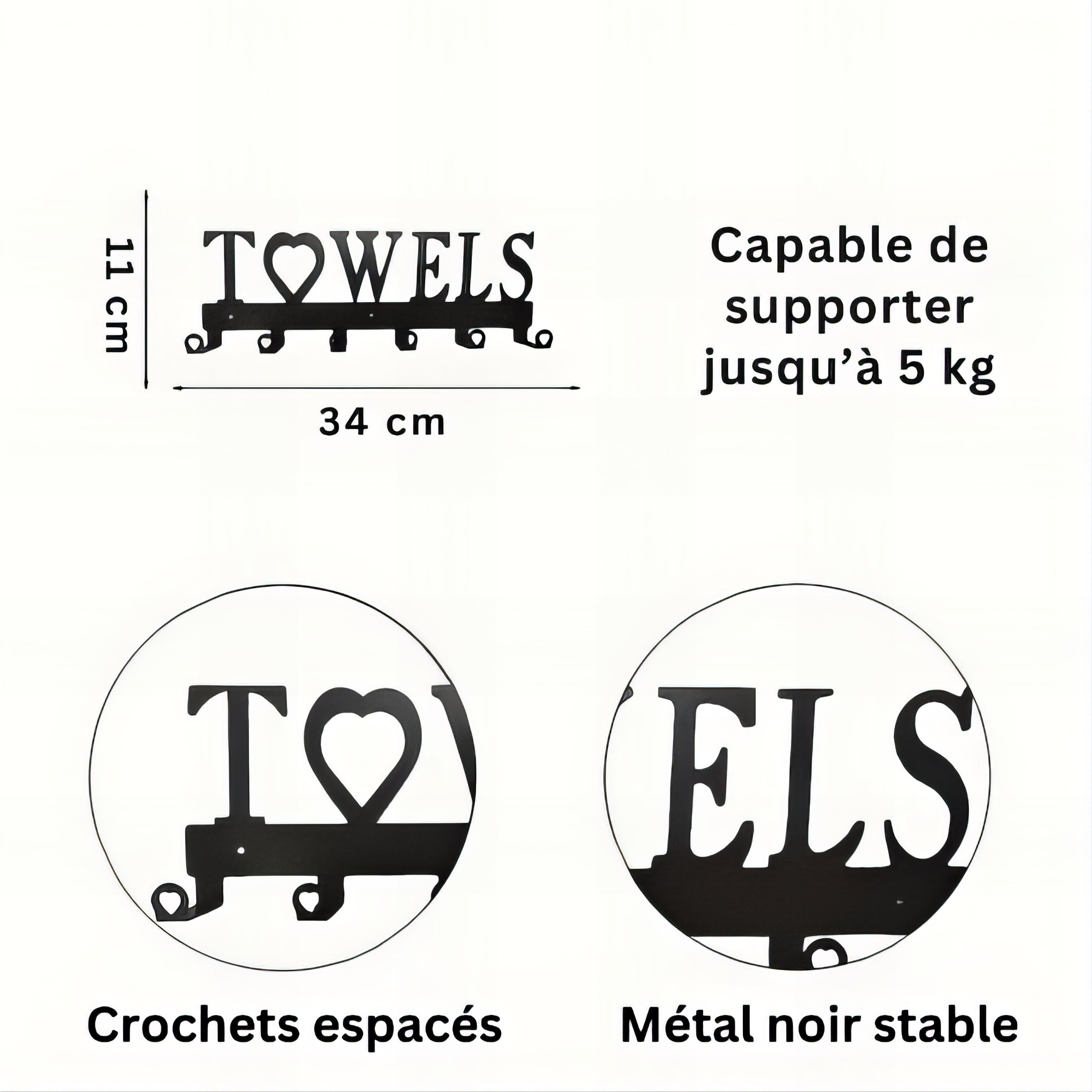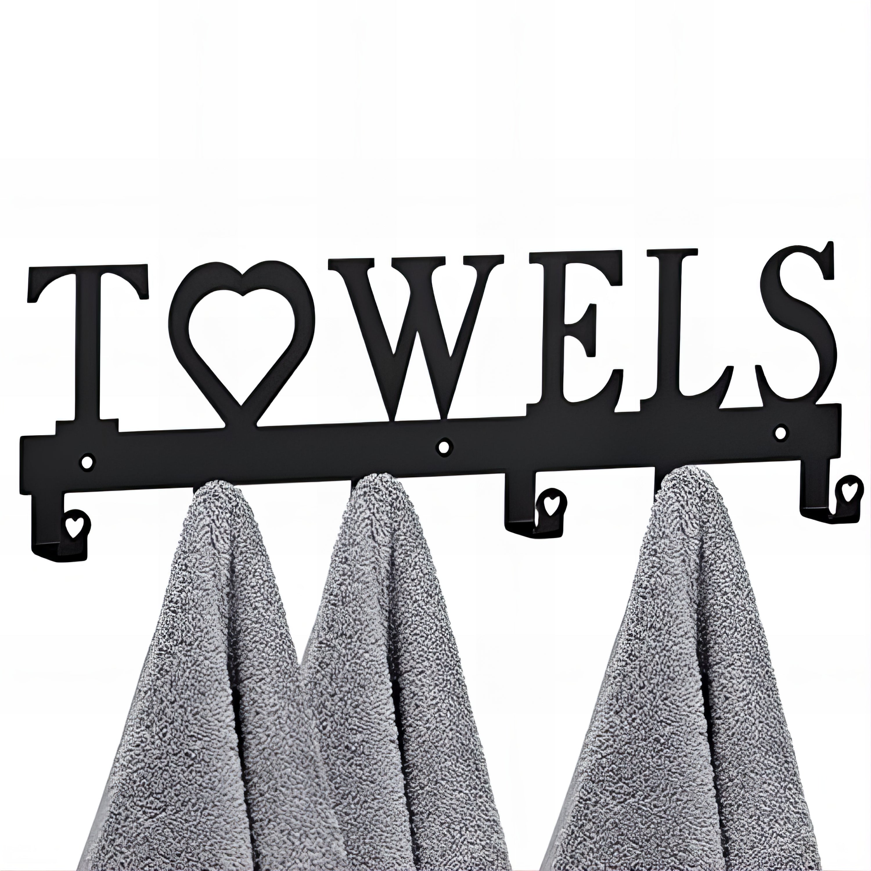 Design pratique : 6 crochets espacés avec embouts en forme de cœur, inscription décorative “TOWELS” avec cœur central