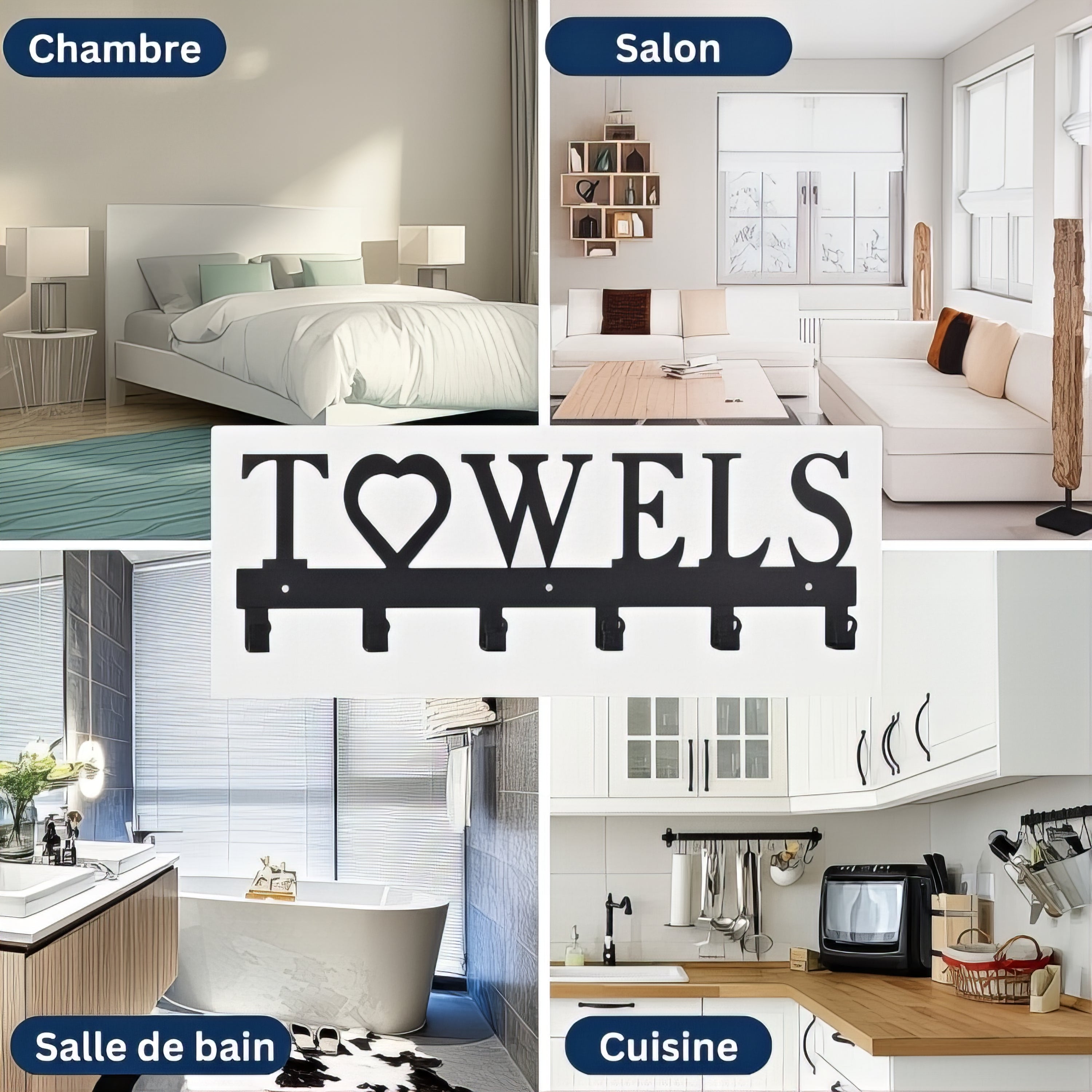 Ce support mural décoratif combine utilité et esthétisme avec son inscription “TOWELS” au design élégant et son cœur intégré. Il transforme le rangement en une touche déco chaleureuse, que ce soit dans la salle de bain, la cuisine, la chambre ou même le salon.